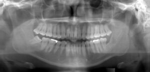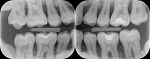 1枚の大きなレントゲンに追加して奥歯の隙間の虫歯の有無の確認のため小さなレントゲンを2枚撮影します。